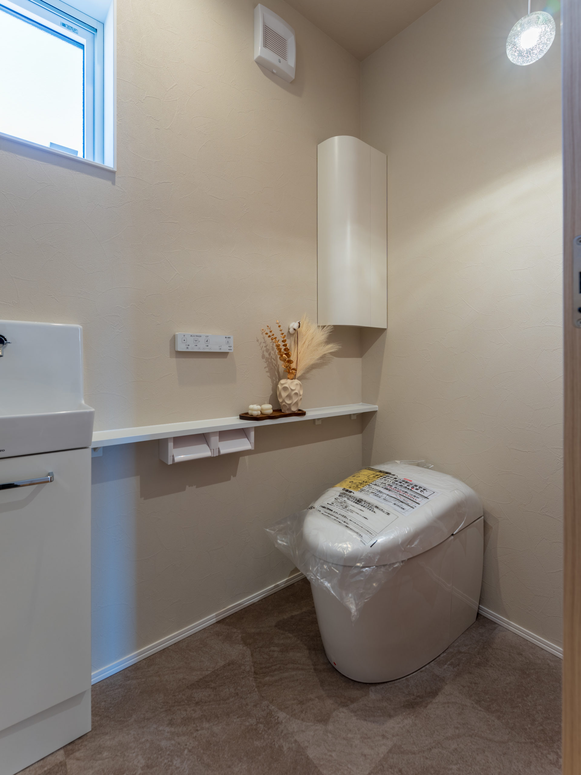 洗面化粧台についても通学・通勤等で使用時間が重なることを考え幅1800㎜の物を使用、トイレについてもトイレトレーニングなどで使えるよう通常よりも広い空間となるよう設計しました。